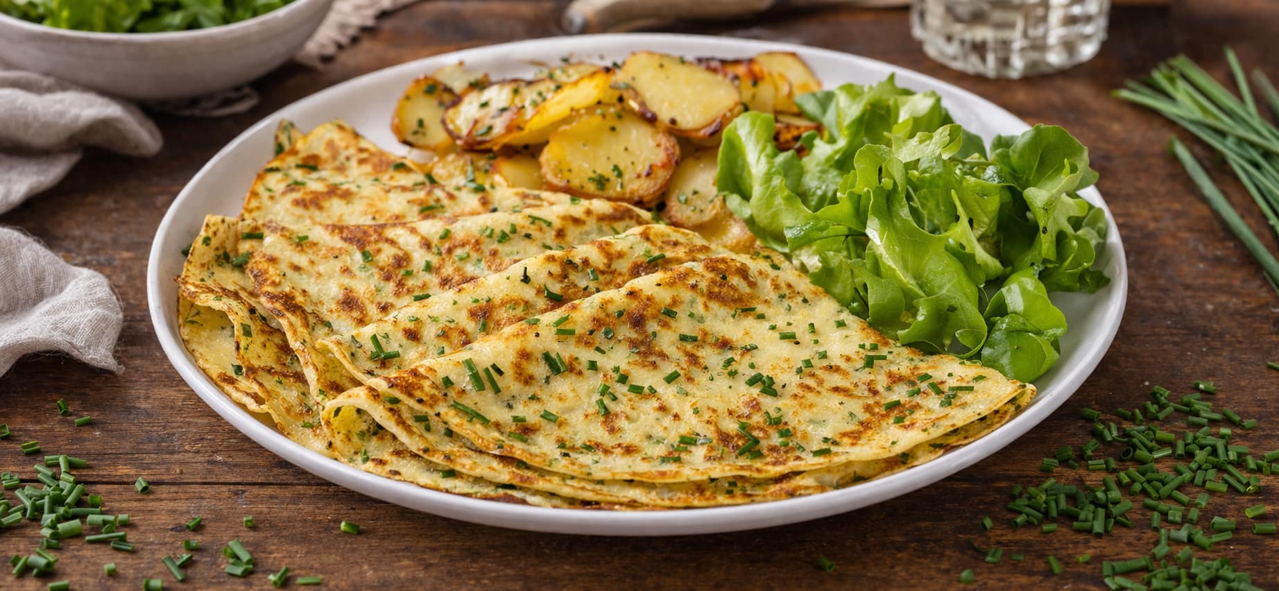 Des crêpes salées moelleuses et parfumées à la ciboulette, une spécialité alsacienne simple et réconfortante. Dorées à la poêle et servies avec une salade verte et des pommes de terre sautées, elles font un repas complet qui régale tout le monde !