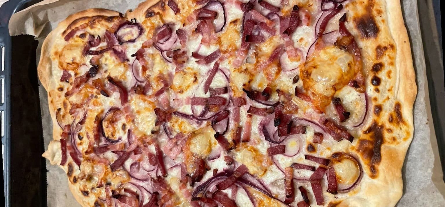 Déposez la pâte sur votre plaque de cuisson. Répartissez la crème sur toute la surface, puis disposez les oignons et le lard. Ajoutez quelques morceaux de munster si vous le souhaitez. Enfournez quelques minutes jusqu’à ce qu’elle soit bien colorée et croustillante.
